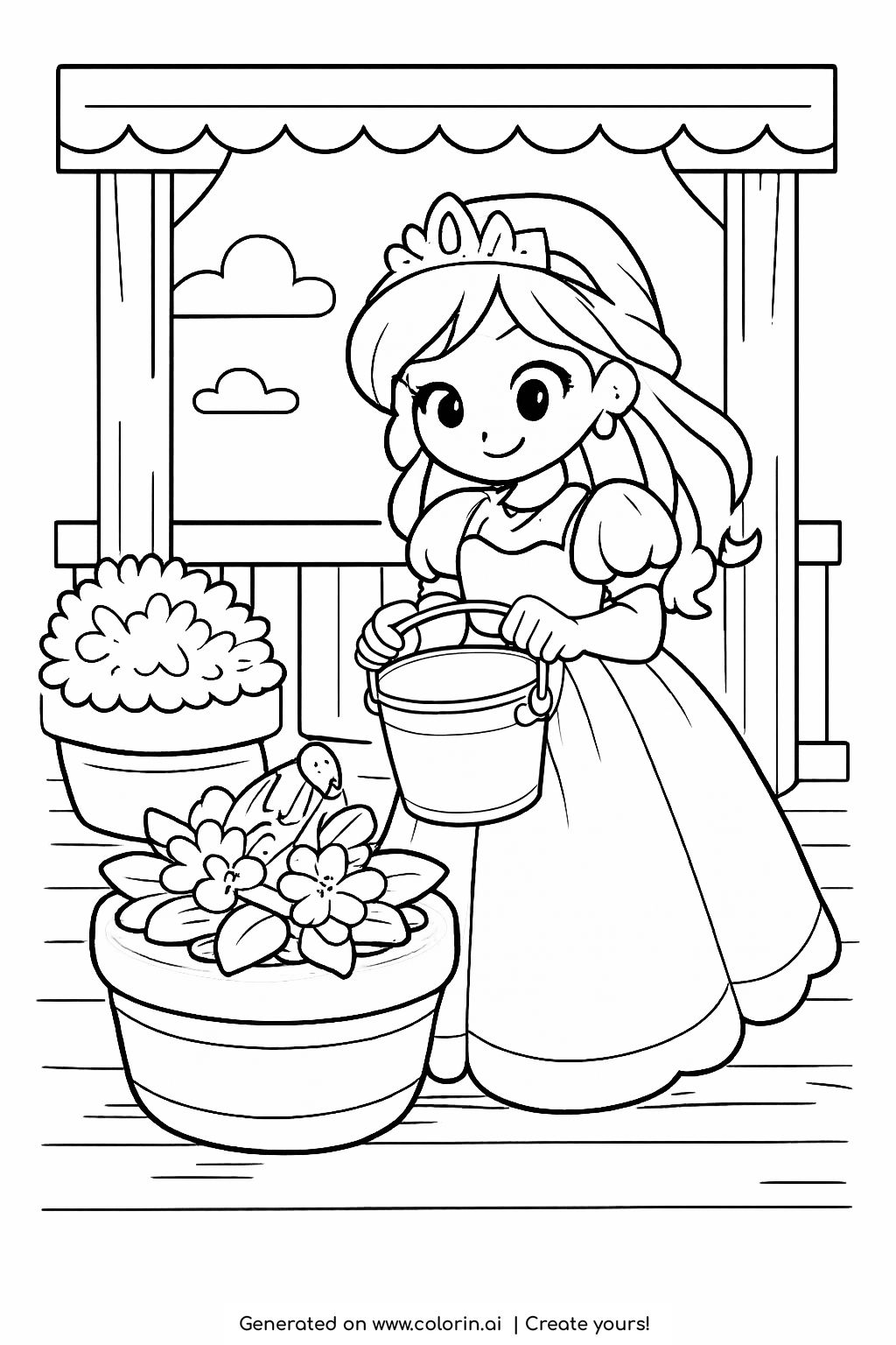 For this page, we entered the concept: princess watering plants on porch coloring page on Colorin AI and generated a print ready coloring page in seconds.