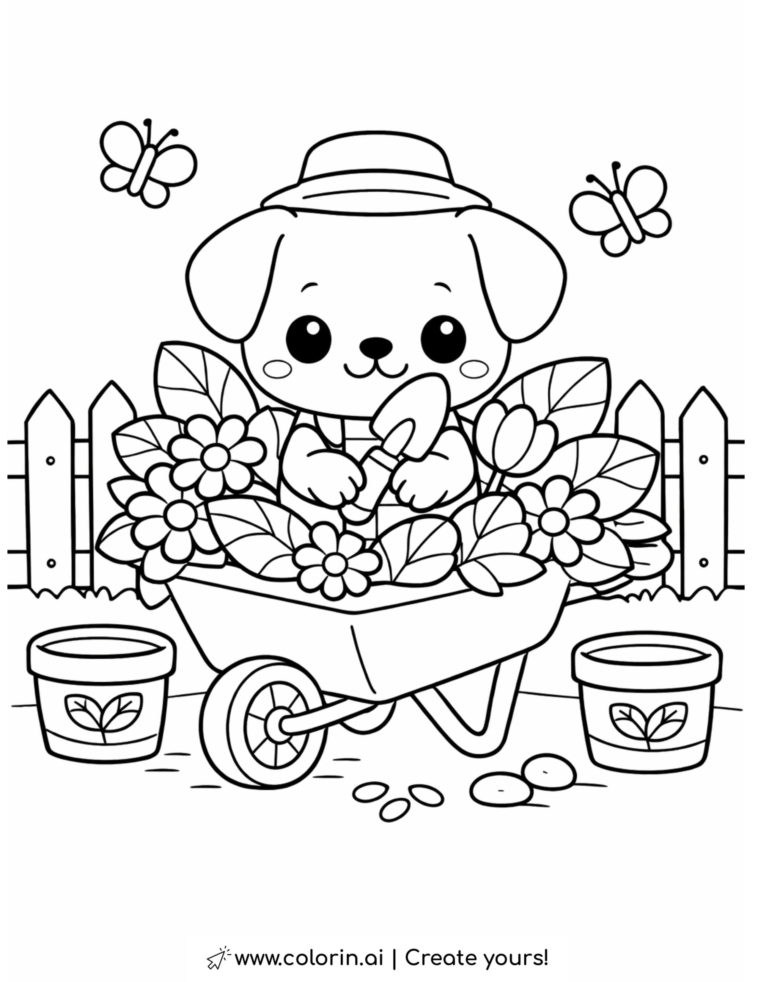 For this page, we entered the concept: puppy gardening in a flower wheelbarrow coloring page on Colorin AI and generated a print ready coloring page in seconds.