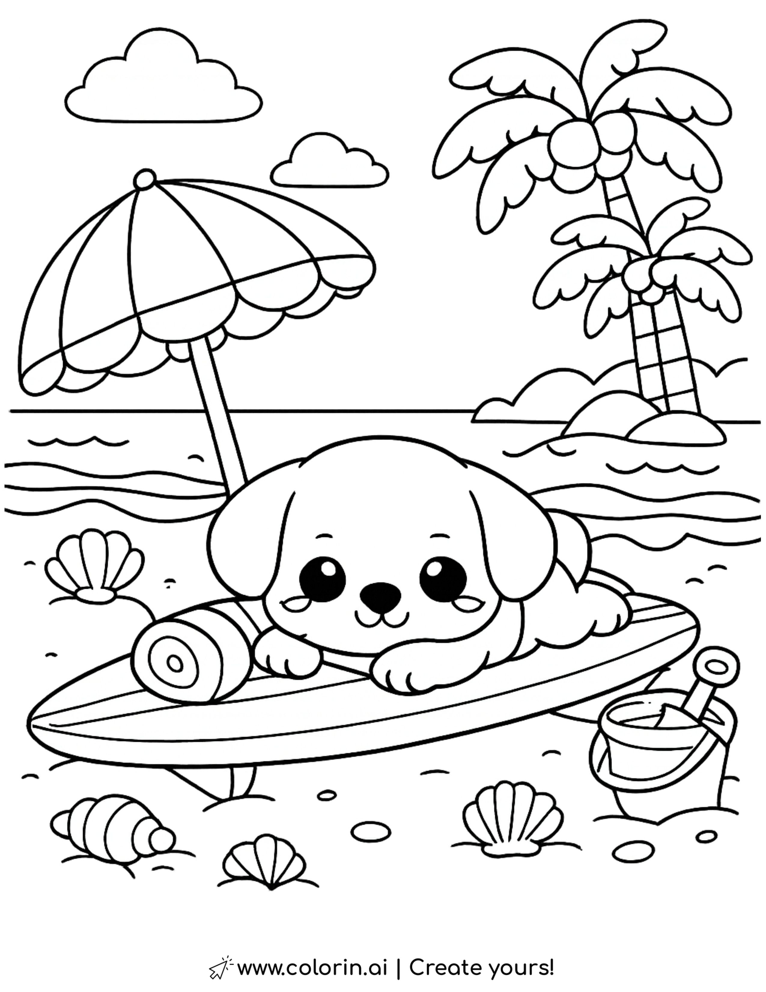 For this page, we entered the concept: puppy relaxing on surfboard at beach coloring page on Colorin AI and generated a print ready coloring page in seconds.
