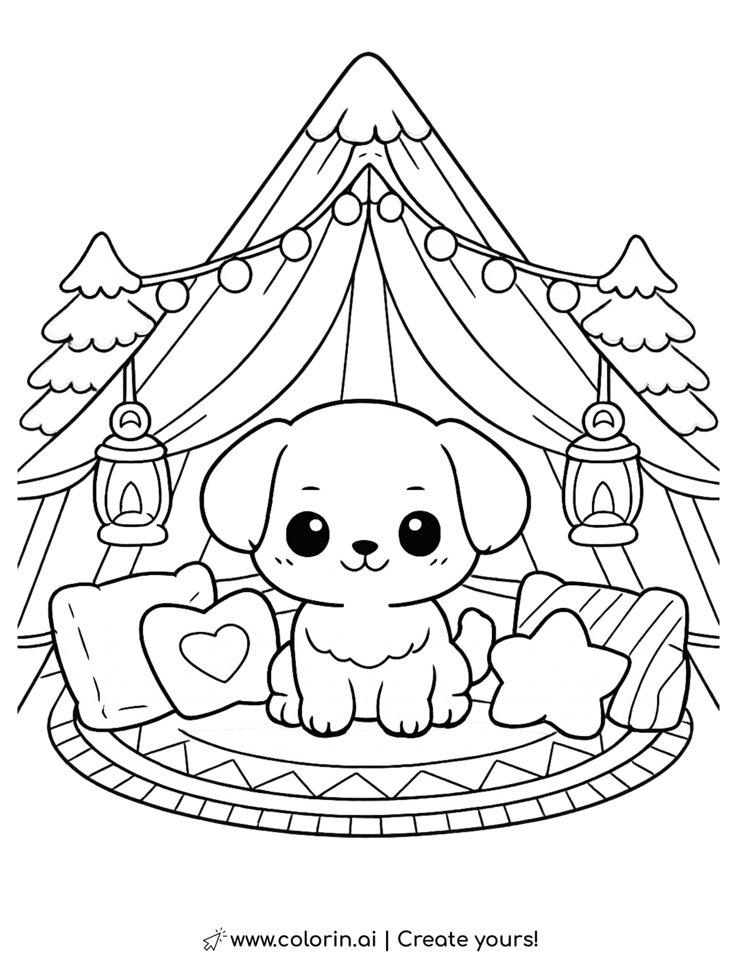 For this page, we entered the concept: puppy sitting in a camping tent coloring page on Colorin AI and generated a print ready coloring page in seconds.