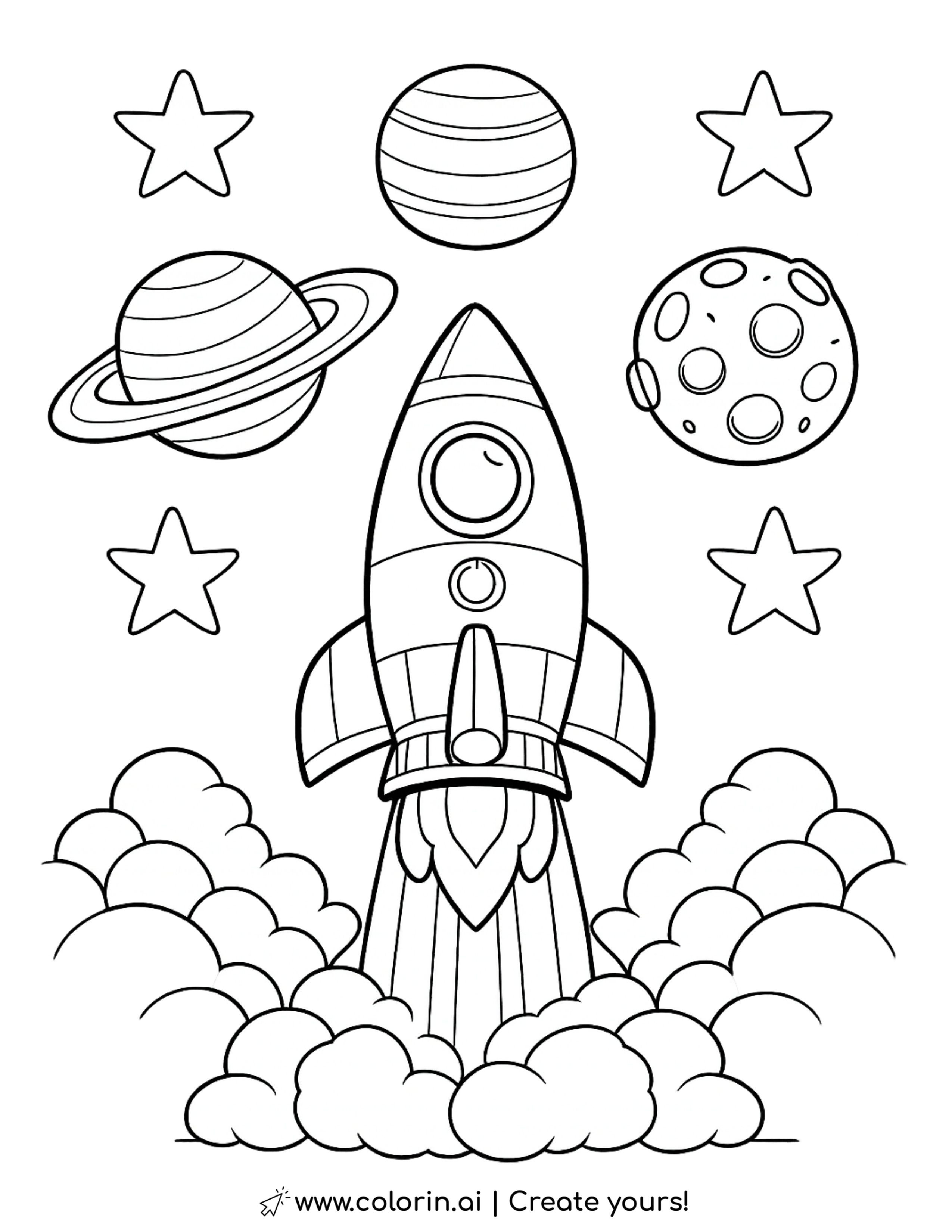 For this page, we entered the concept: rocket launching into space coloring page on Colorin AI and generated a print ready coloring page in seconds. Then we added dynamic space details to make the scene feel more alive, all in just a few minutes. You can follow the same process to create your own coloring pages, or build full coloring books without any design skills.
