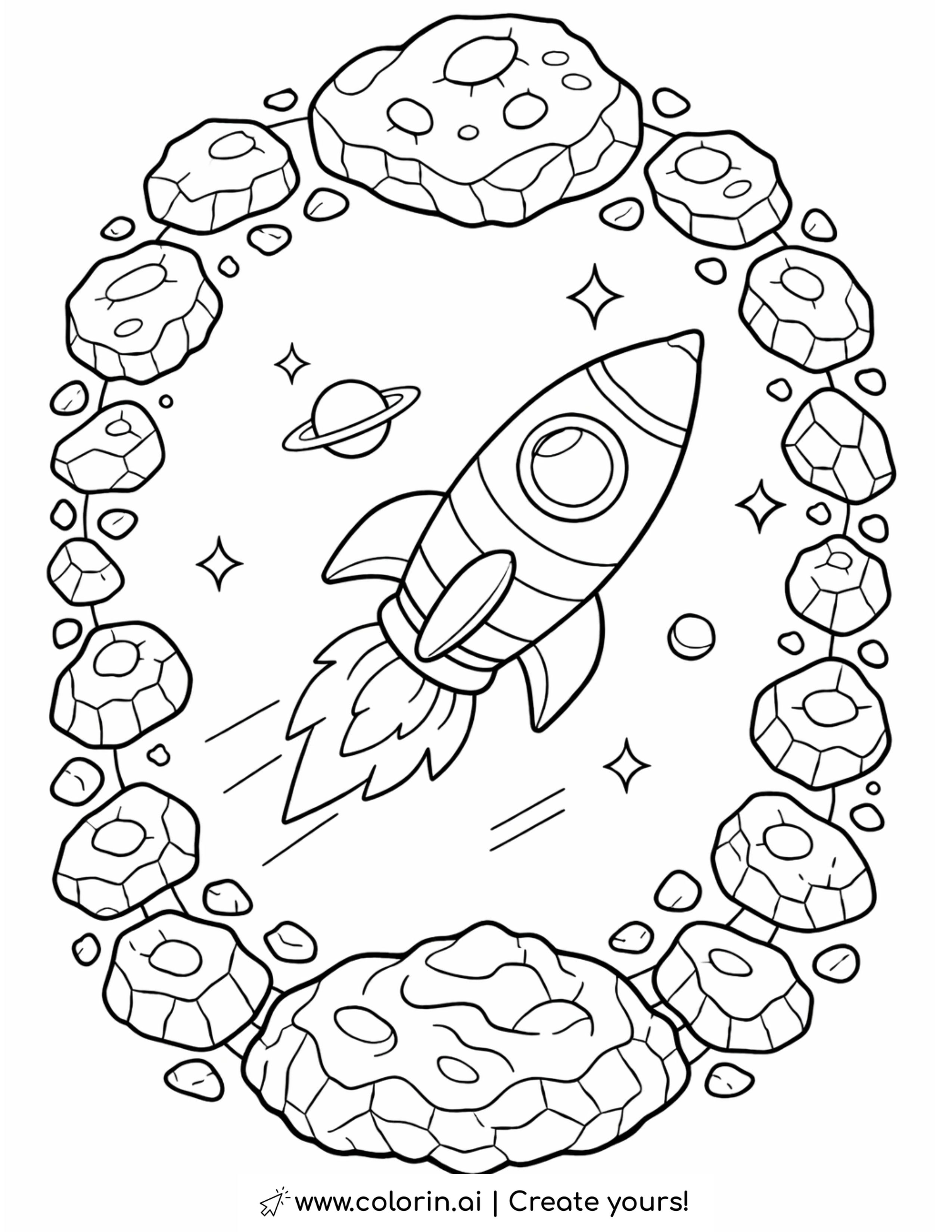 For this page, we entered the concept: rocket through asteroid belt coloring page on Colorin AI and generated a print ready coloring page in seconds. Then we arranged the asteroids in a circular composition to frame the rocket and create a balanced space scene. This simple process allows anyone to generate printable coloring pages or even entire coloring books without needing drawing skills.