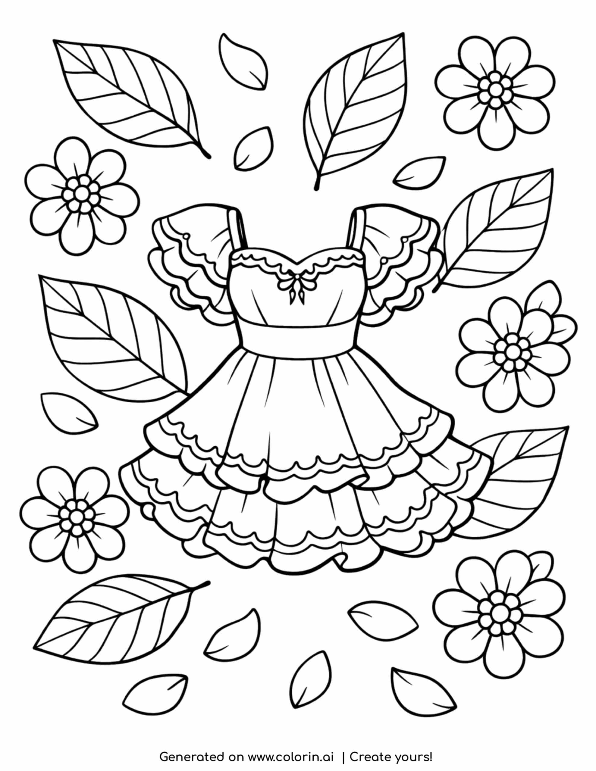 This coloring page encourages creativity by combining fashion and nature elements in one design. It helps improve fine motor skills as you carefully color detailed areas like ruffles and petals. It also allows for artistic exploration through color combinations and shading techniques.