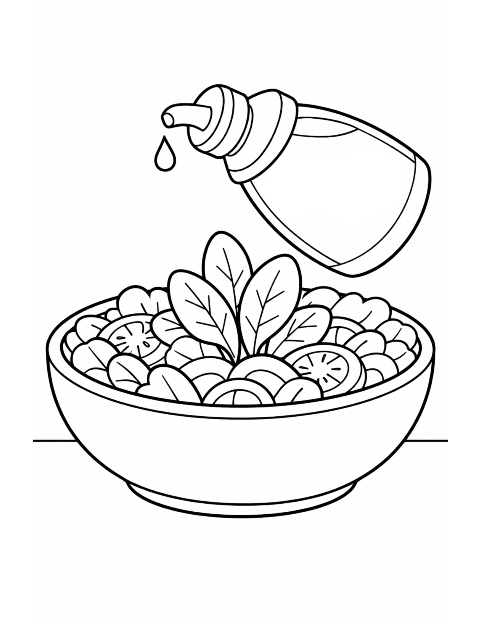 Overall, this page is great for relaxation because the large bowl shape creates a calm, centered composition. At the same time, the repeating leaf forms help build concentration as you color one section at a time. Moreover, filling smaller details like the slices and the dressing drop supports fine motor control and steady hand movement.