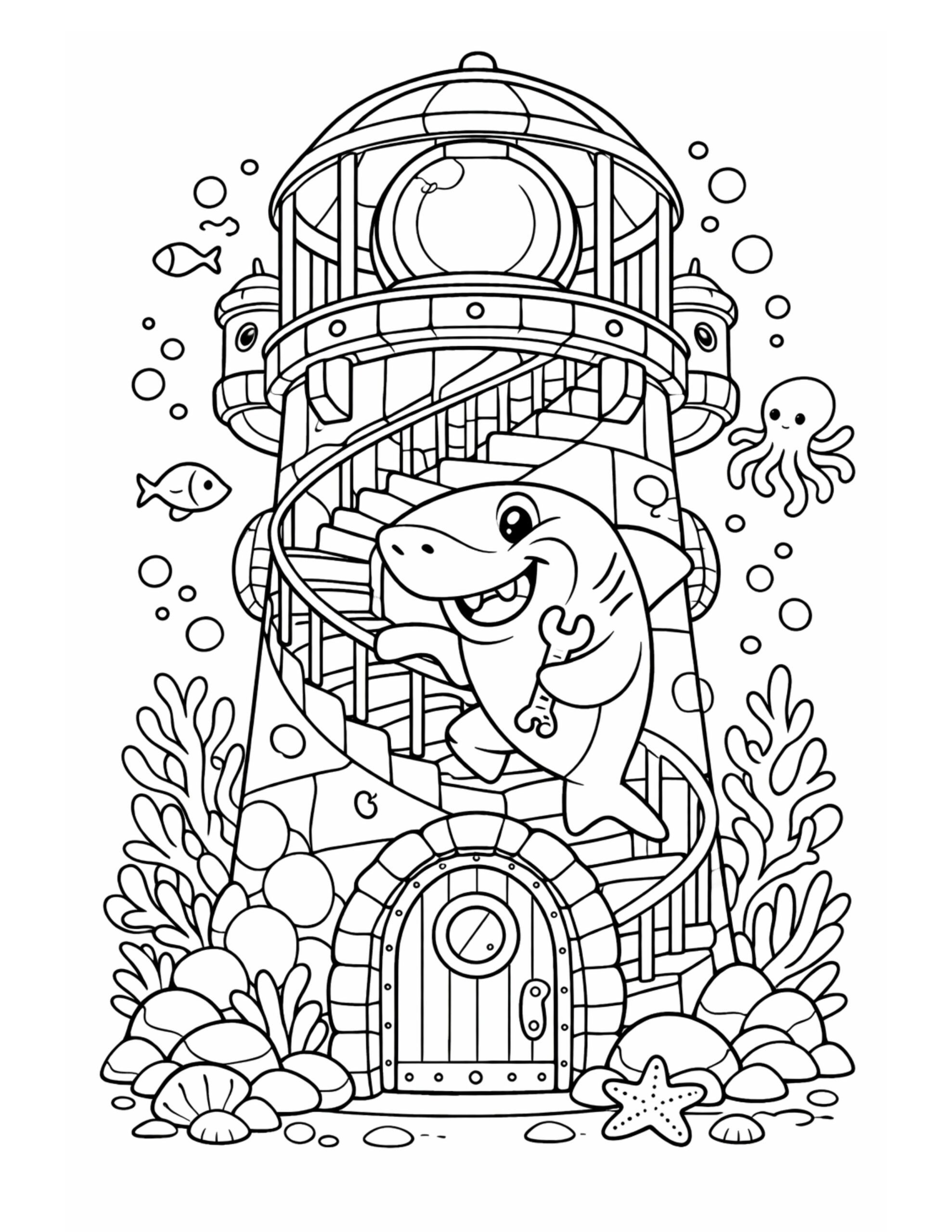 The shark climbing a lighthouse staircase coloring page captures a cheerful underwater moment with a big smile and a busy shark on a spiral stairway. Near the bottom, a rounded door sits like a tiny entrance to an ocean tower, while coral, shells, and bubbles frame the scene. Meanwhile, small sea friends float nearby, adding extra charm without crowding the lines. Altogether, it feels lively and fun, so it’s easy to imagine bright colors bringing every detail to life.