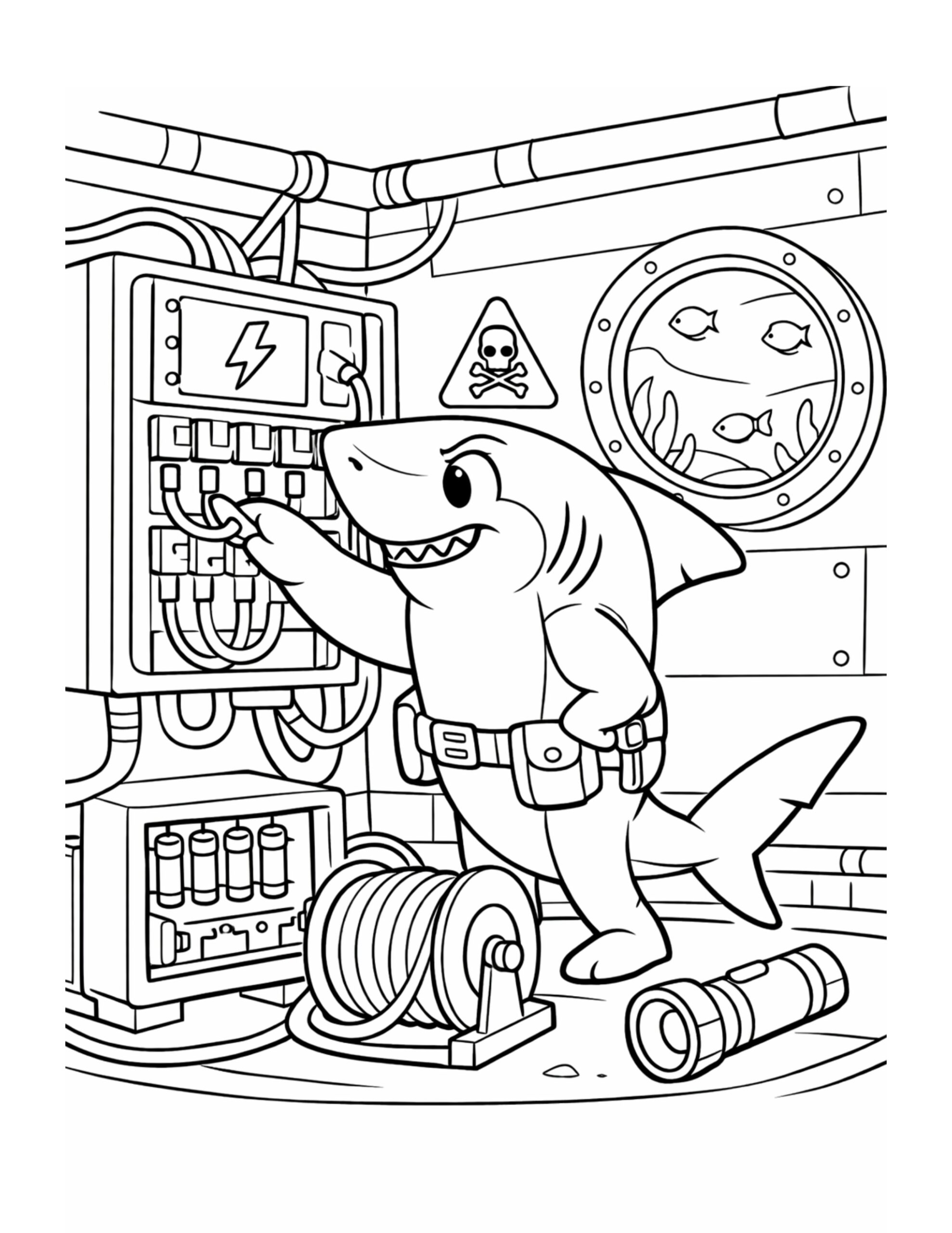 To start, shades of blue or gray work well for the shark and help keep the underwater feeling consistent. Meanwhile, the control panel can be colored with bright reds, yellows, or greens to highlight the buttons and switches. Additionally, using darker tones on the cables adds depth and contrast to the scene. Colored pencils are great for precise areas, while markers can make the mechanical elements stand out more clearly.