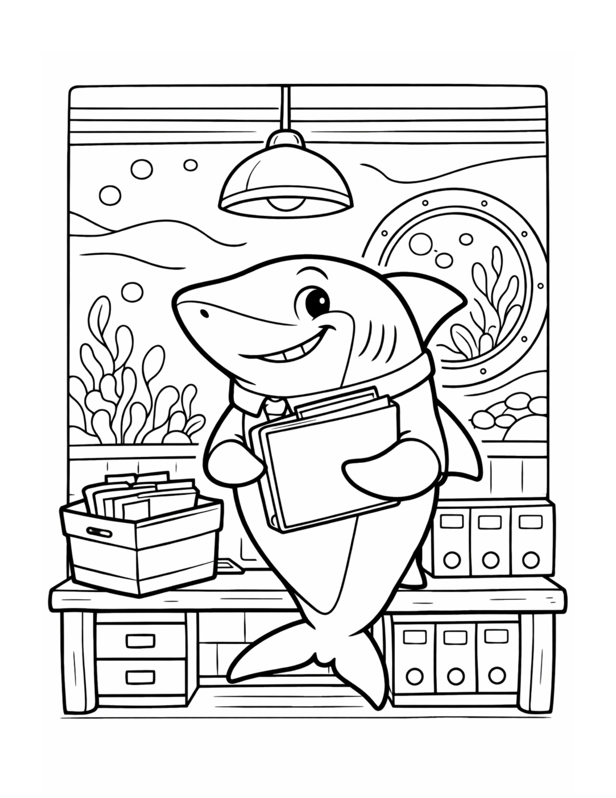 The shark holding office files coloring page shows a cheerful shark standing in an underwater office while carrying folders. At first glance, the scene feels playful and unexpected, which makes it especially fun to color. Because of its friendly expression and clear details, this illustration invites creativity and imagination.