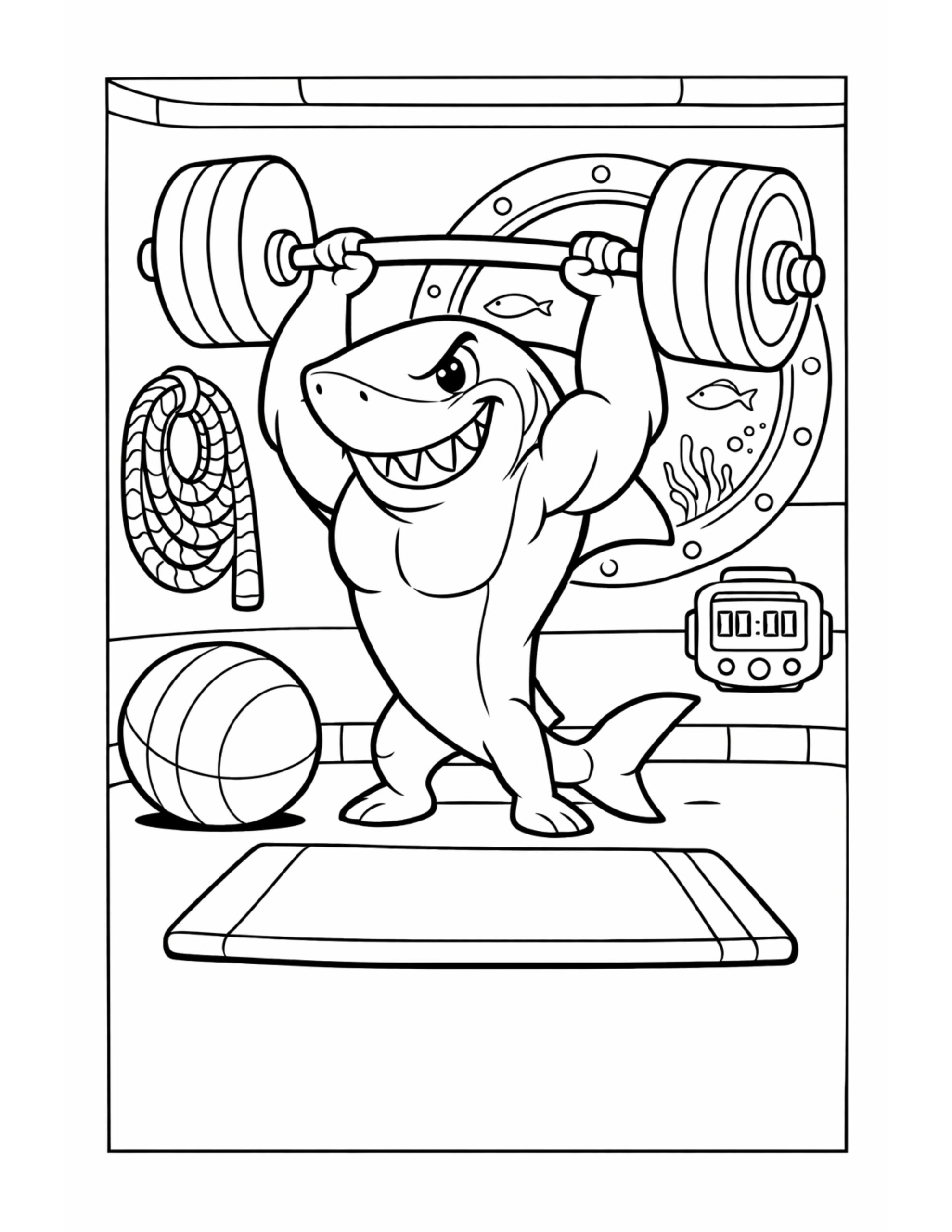 To start, color the shark in cool ocean tones like light gray, steel blue, or even a friendly turquoise. Then, add contrast by shading the belly a softer tone, which helps the muscles pop. Meanwhile, the barbell plates look great in dark graphite with small white highlights for a metallic feel. Also, try bright accent colors on the gym items, like a red mat or a neon stopwatch, to boost the sporty energy. Finally, a pale blue wash behind the porthole can suggest water without adding extra objects.