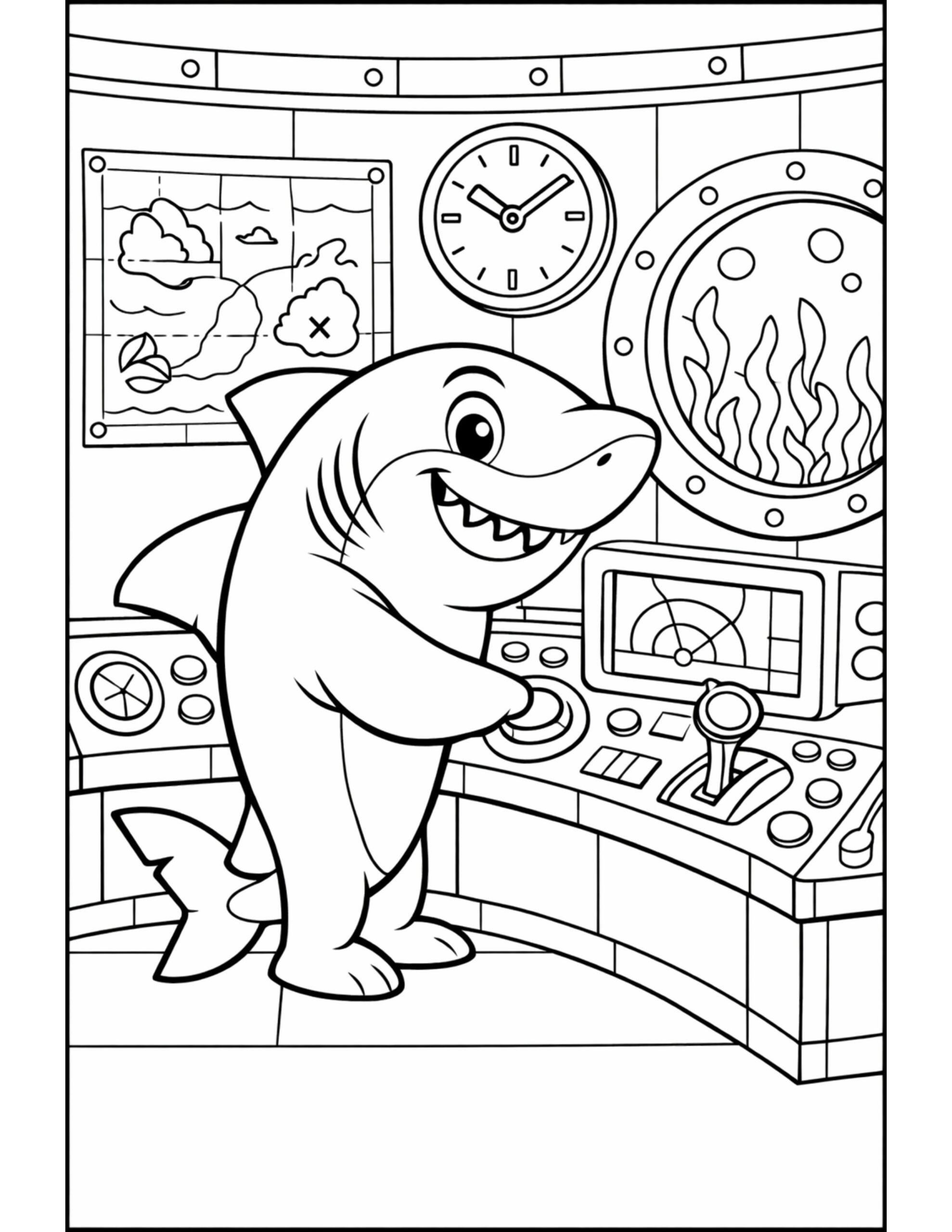 Shark Operating Submarine Controls Coloring Page