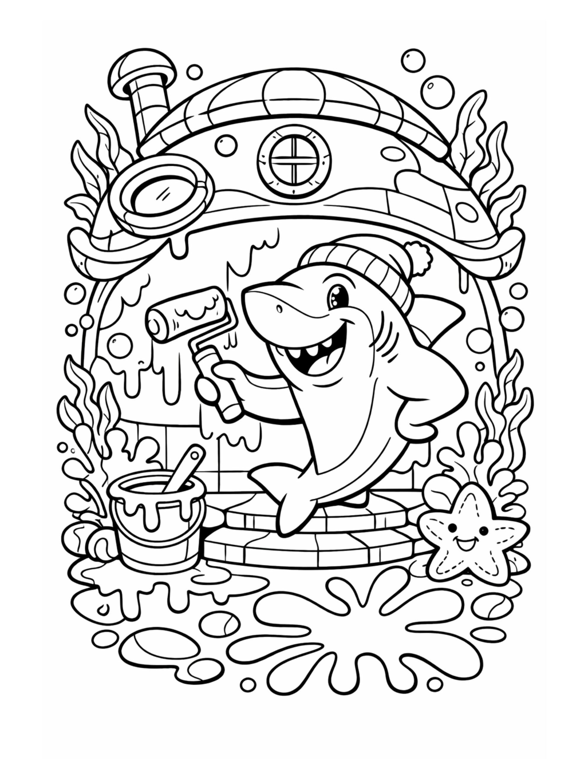 The shark painting an underwater house coloring page shows a smiling shark in a cozy beanie, decorating a round underwater home with a paint roller. Right away, the dripping paint, bubbles, and sea plants make the scene feel lively and humorous. Because the shapes are bold and clear, this page is relaxing to color while still feeling creative.