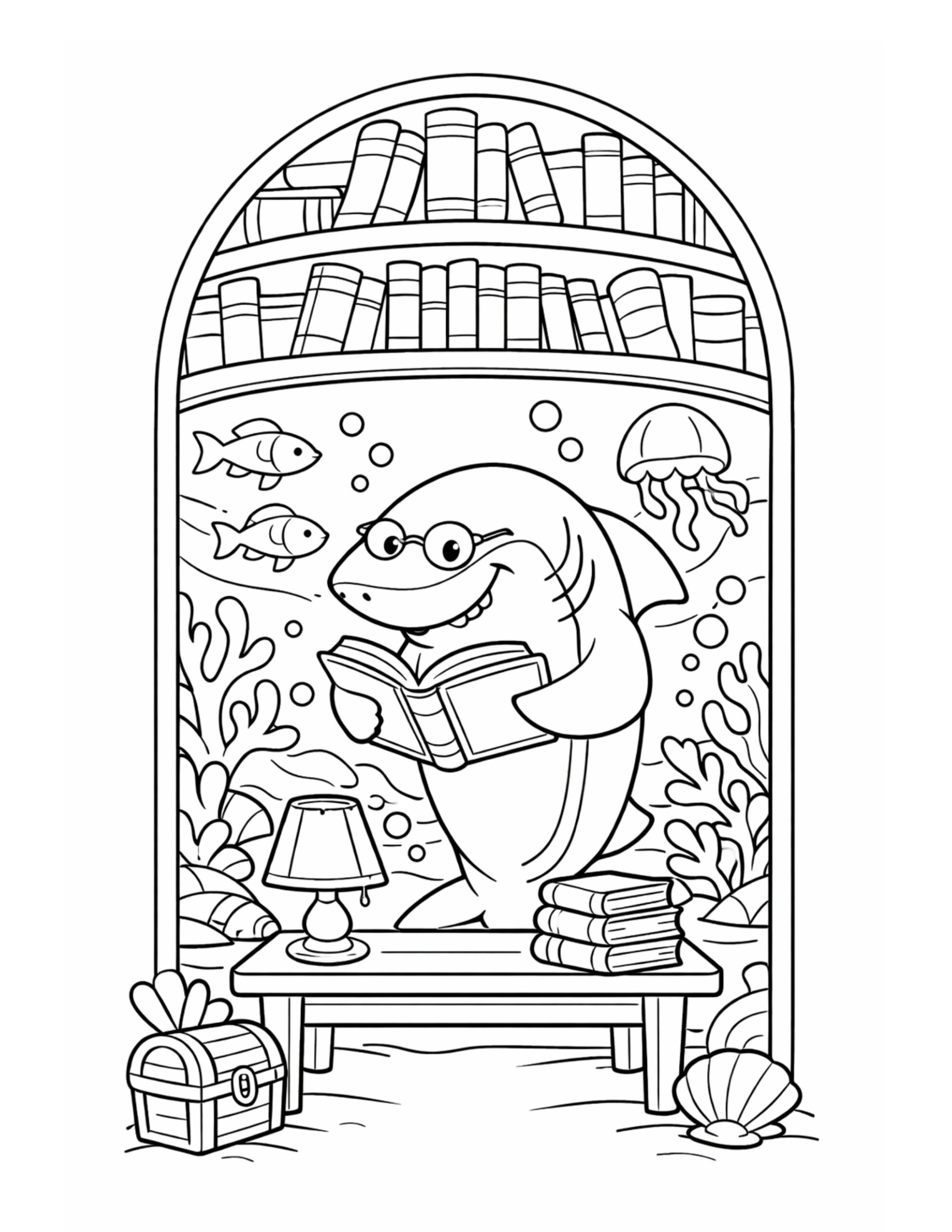 The shark reading in underwater library coloring page features a friendly shark wearing glasses while enjoying an open book. Around the scene, tall shelves filled with books curve overhead, which makes it feel like a cozy ocean library. Meanwhile, a small table with a lamp and a stack of books adds extra detail that is fun to color. Overall, the gentle lines and cute sea visitors make this page relaxing and playful.