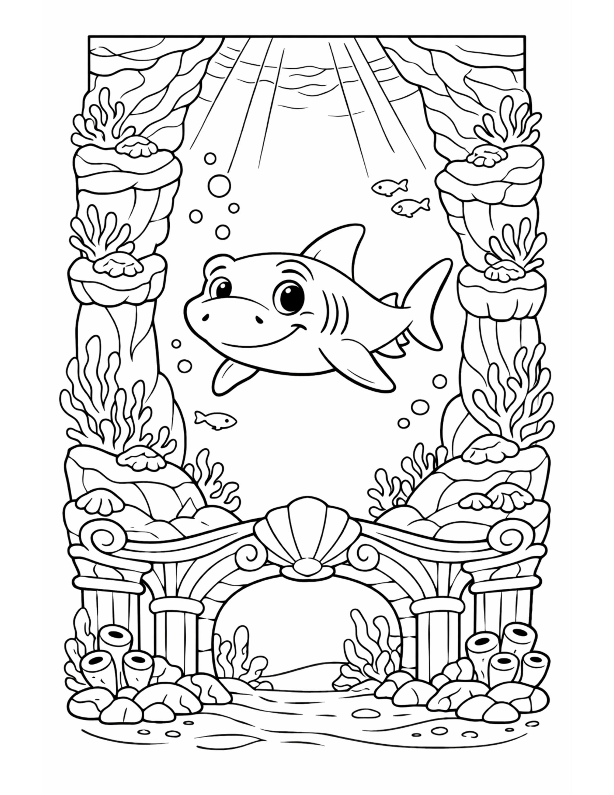 To begin, color the shark in soft gray or muted blue, and then add a lighter belly for contrast. Next, use cool blues and teals in the water, keeping the top area lighter under the sun rays. After that, shade the columns with sandy beige or stone gray, so they feel like old ruins. Meanwhile, you can add gentle green tones to the coral and sea plants to frame the scene. For extra depth, blend a darker shade along the column edges and under the archway. Finally, keep some bubbles white so the page looks bright and clean.