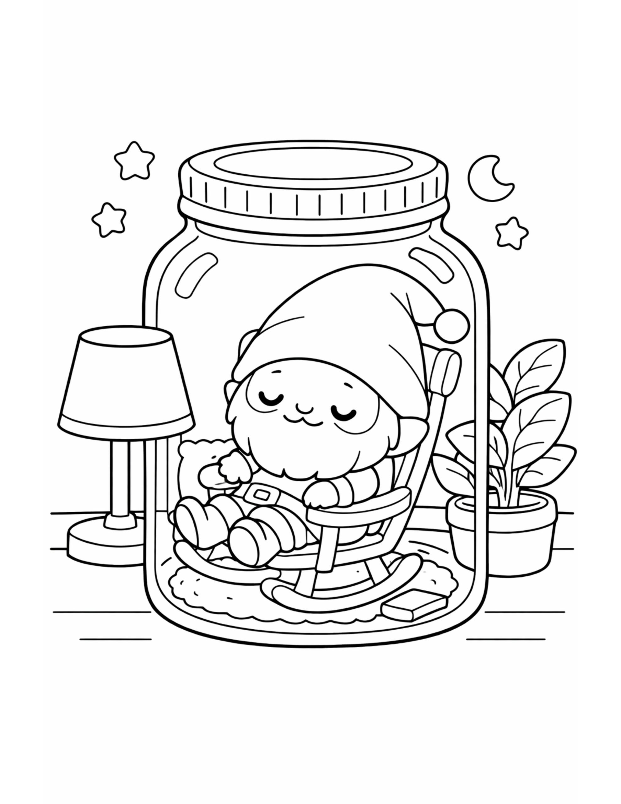 With this sleepy gnome in a jar coloring page, you get a calm little bedtime scene that feels sweet and cozy. Inside the big jar, a tiny gnome rests in a rocking chair on a soft rug, so it’s relaxing to color. Meanwhile, the moon, stars, lamp, and plant add simple shapes that make shading extra fun.