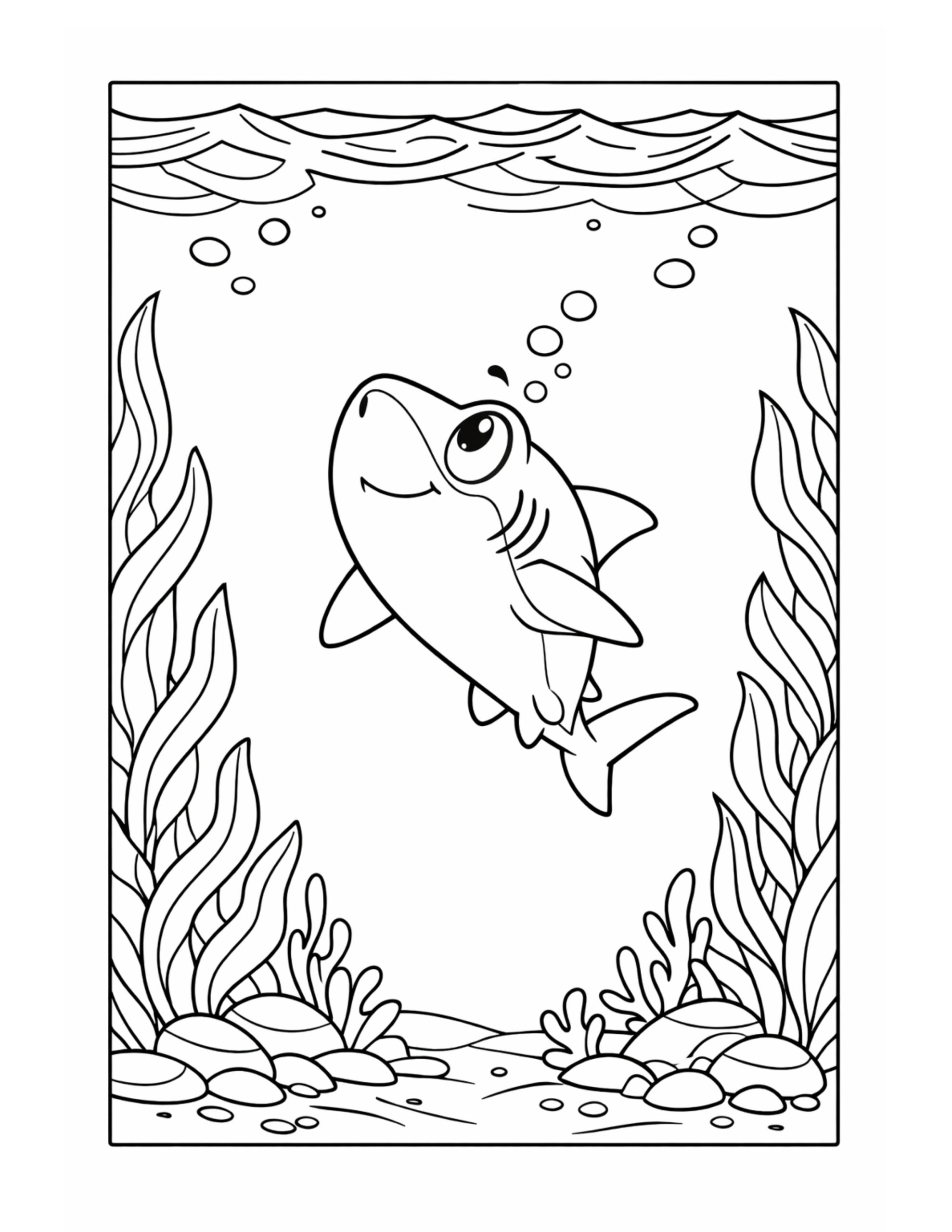To begin with, light blues and turquoise shades work well for the water background. Meanwhile, the shark can be colored in soft grays, pale blues, or even playful pastel tones for a friendly look. In addition, adding gentle gradients to the sea plants helps create depth without making the page too complex. Finally, leaving some white highlights on the bubbles can make the underwater scene feel fresh and lively.
