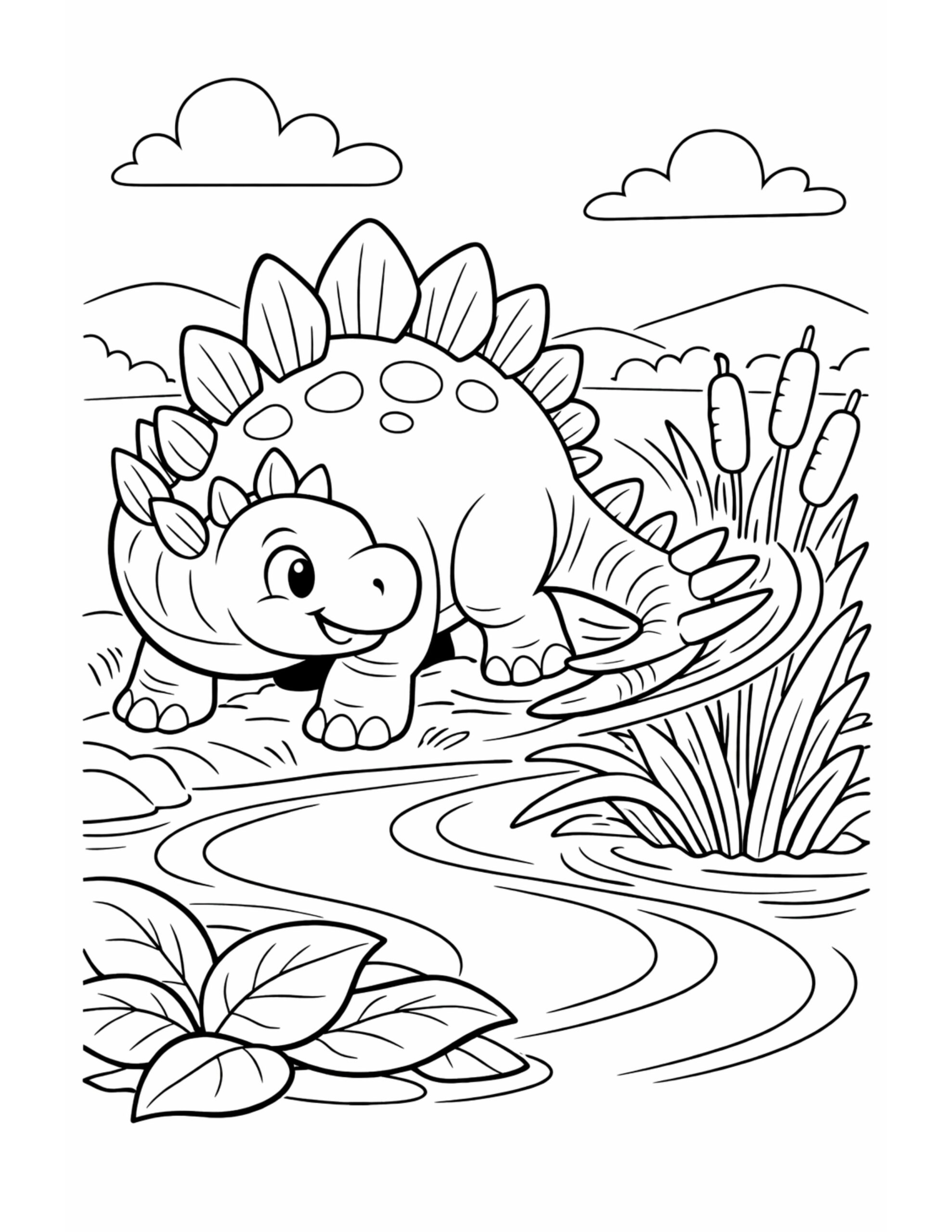 The smiling stegosaurus by a stream coloring page shows a friendly dinosaur standing beside gently flowing water in a calm natural setting. In the scene, soft hills, simple clouds, and tall plants frame the stegosaurus, creating a peaceful and playful atmosphere. Because the lines are clear and the shapes are easy to follow, this page is especially enjoyable for relaxed and creative coloring sessions.