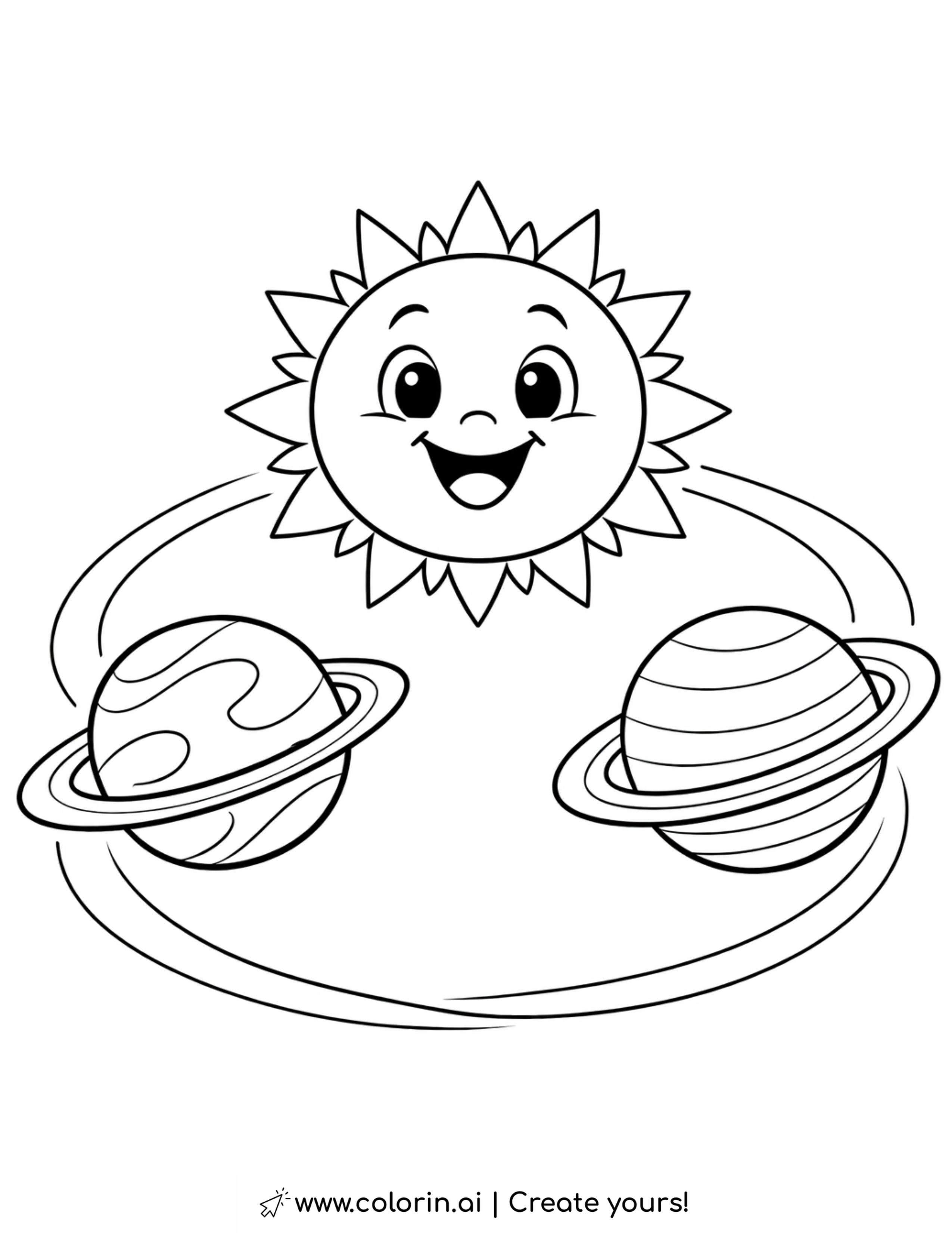 Coloring a solar system themed illustration encourages curiosity about space and astronomy. The friendly smiling sun and orbiting planets help children imagine how celestial bodies move through space.