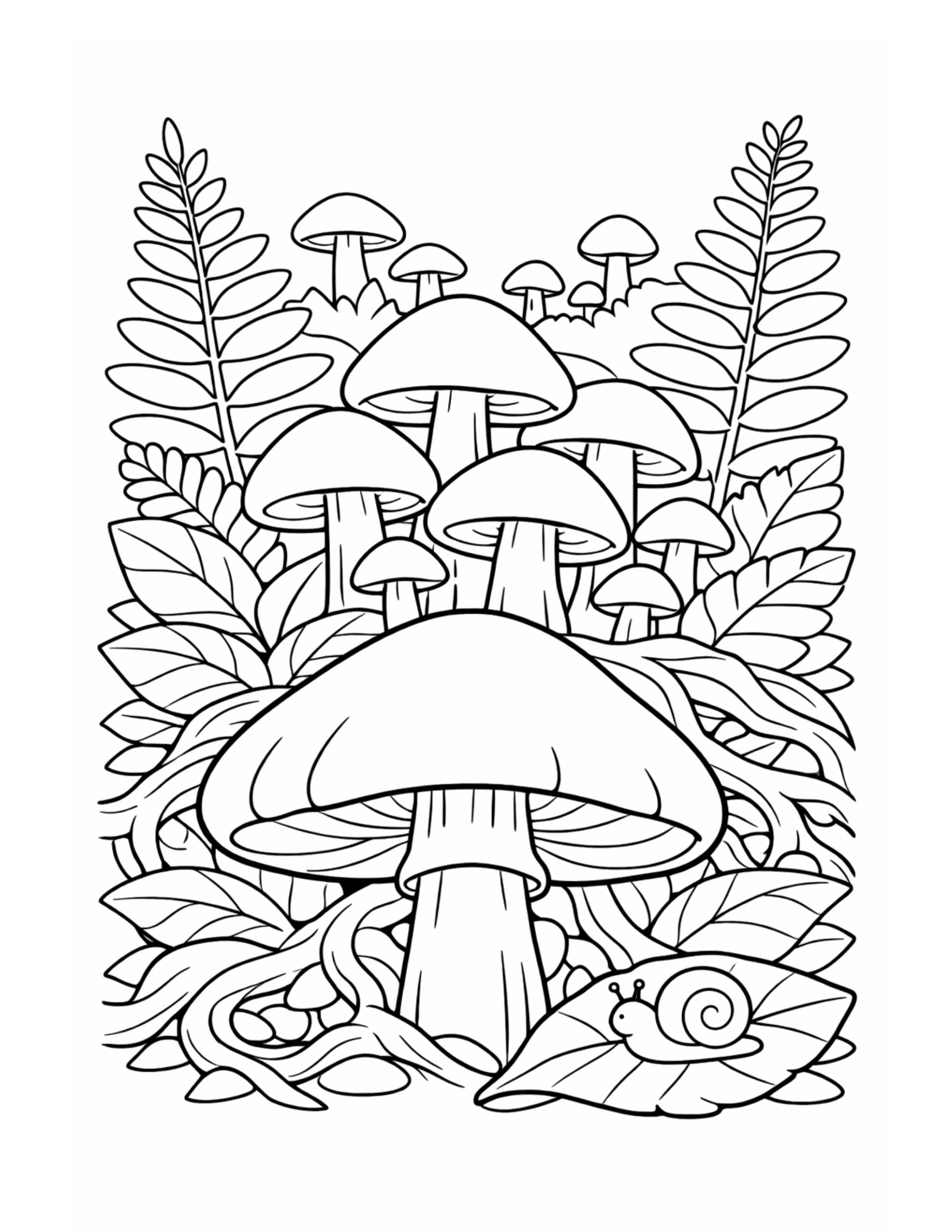 Because the page mixes large shapes with smaller details, it supports focus while letting you switch pacing when you want. At the same time, coloring around the leaf edges and mushroom gills builds fine motor control through careful, steady strokes. Also, choosing colors for the plants and mushrooms boosts creativity, since many palettes can work nicely here. Most importantly, the gentle nature theme encourages relaxation, so it’s a pleasant activity for quiet afternoons or winding down.