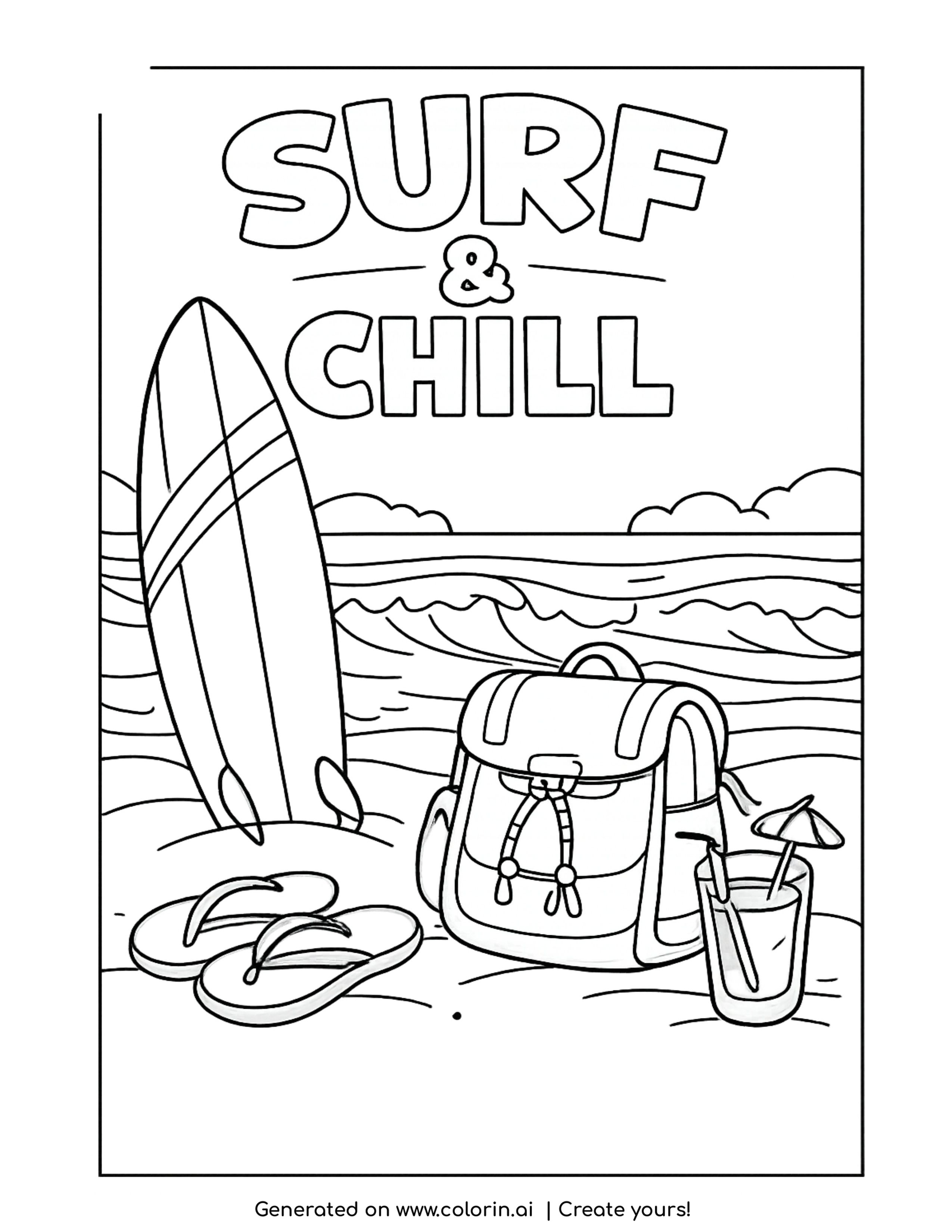 The surfboard with backpack and sandals surf chill coloring page shows a relaxed beach scene with a surfboard standing in the sand beside a backpack and flip flops. A refreshing drink sits nearby while gentle ocean waves roll in the background. Altogether, the “Surf & Chill” text adds a laid-back vibe that makes this page fun and calming to color.