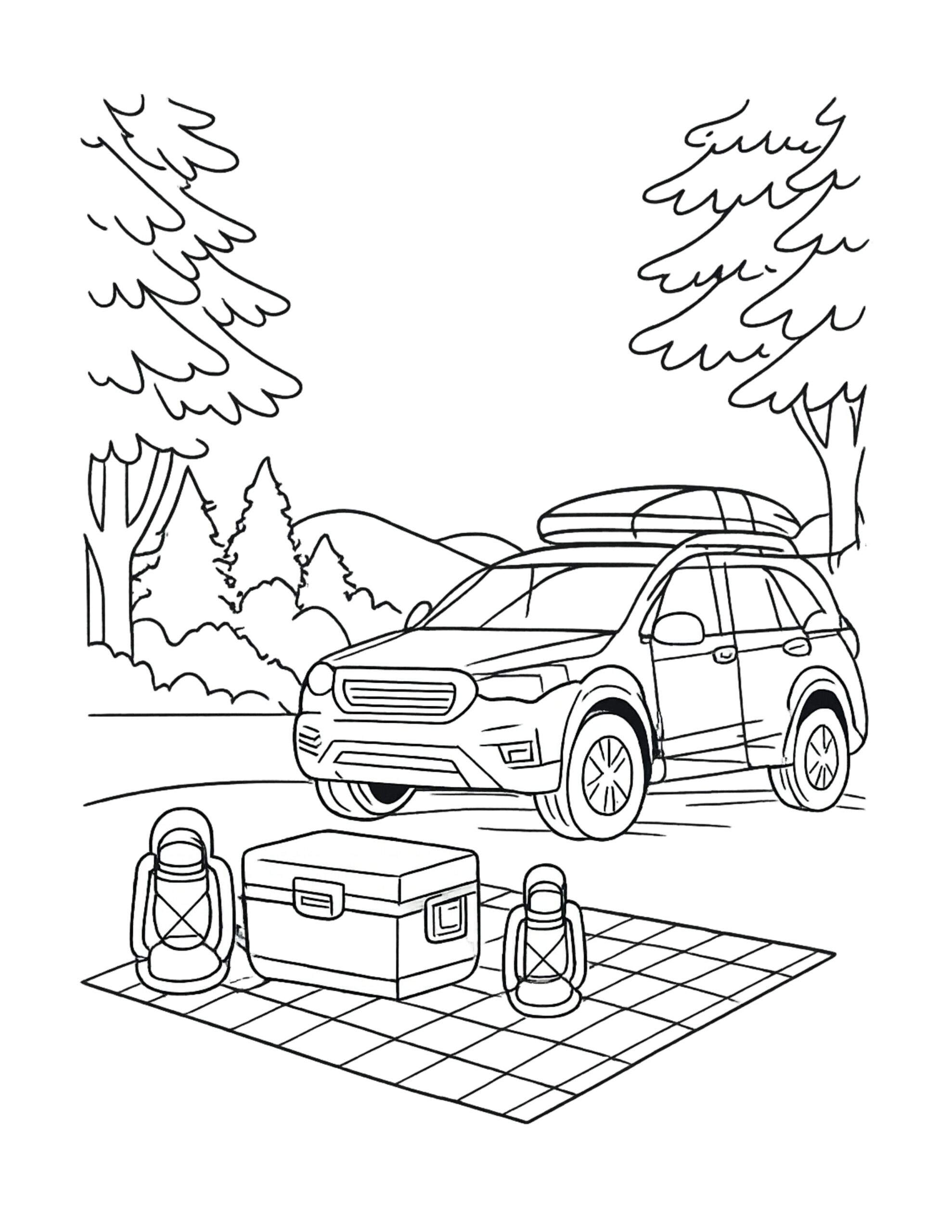 This suv parked at campsite picnic coloring page shows a road trip SUV pulled over near tall trees and rolling hills. Meanwhile, a picnic blanket sits in the foreground with a cooler and two lanterns ready for the evening. Because the scene mixes big shapes with small details, it feels relaxing and satisfying to color.