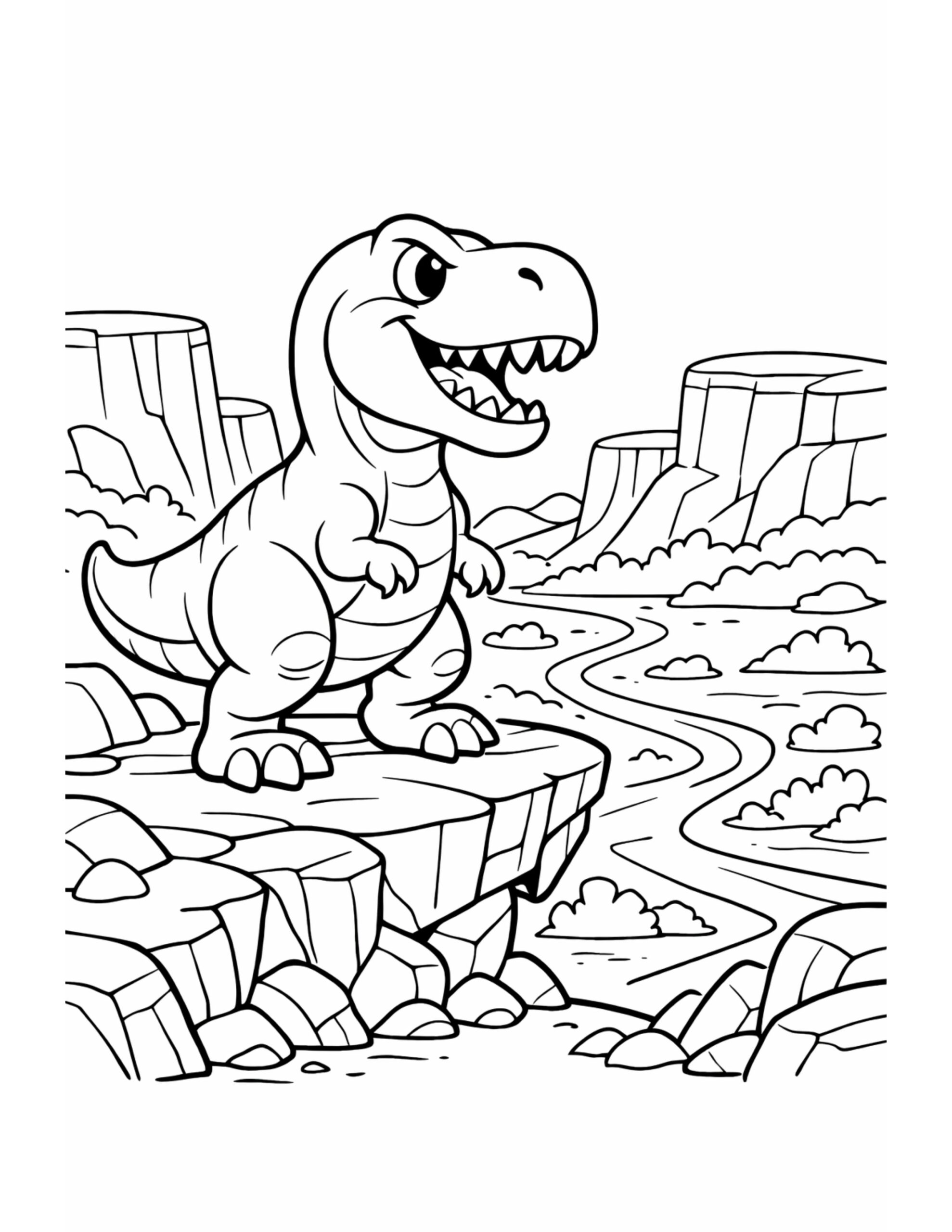 To begin, the t rex on canyon cliff coloring page puts a fierce dino on a rocky ledge high above a winding river. In the distance, wide cliffs and mesa shapes create an open desert canyon feel. Plus, the big outlines and clear spaces make it exciting to color, whether you use crayons or markers.