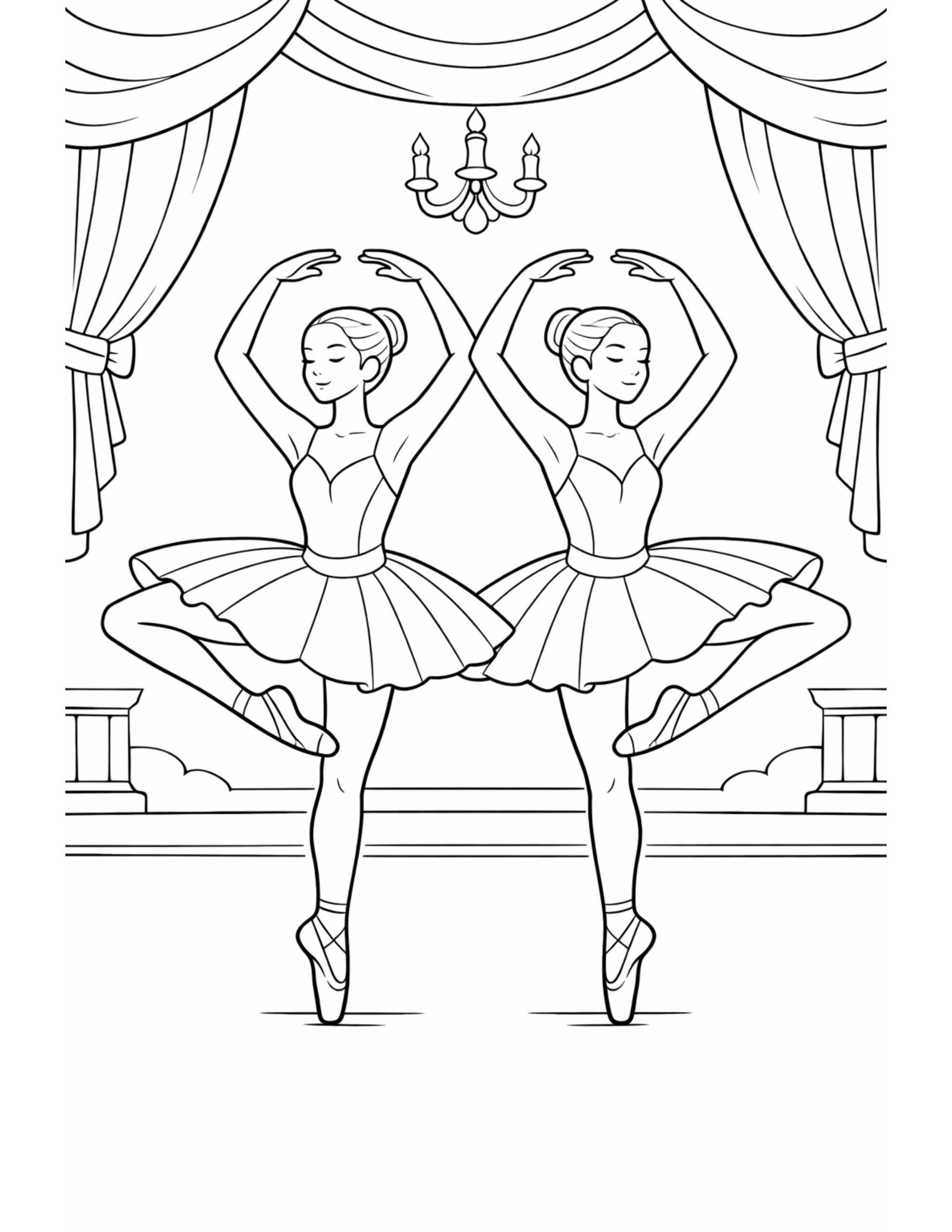 First, this twin ballerinas under chandelier pose coloring page highlights two dancers in matching positions, arms rounded overhead and legs lifted in a balanced stage stance. Meanwhile, the tall curtains on both sides create a classic theater frame, which feels neat and symmetrical. As a result, it’s a satisfying page to color because you can repeat colors on both figures or experiment with subtle differences.