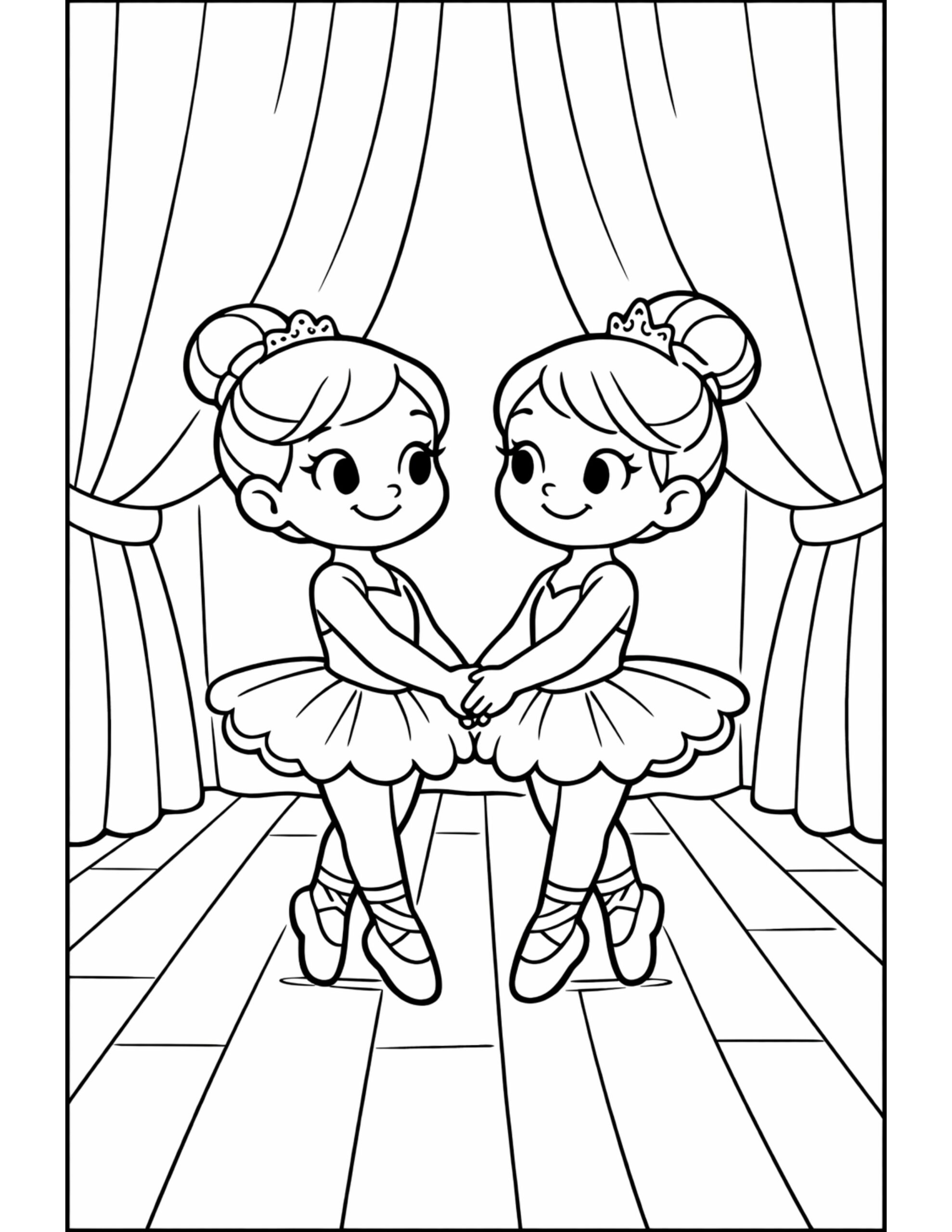 Two Ballerinas Holding Hands on Stage Coloring Page