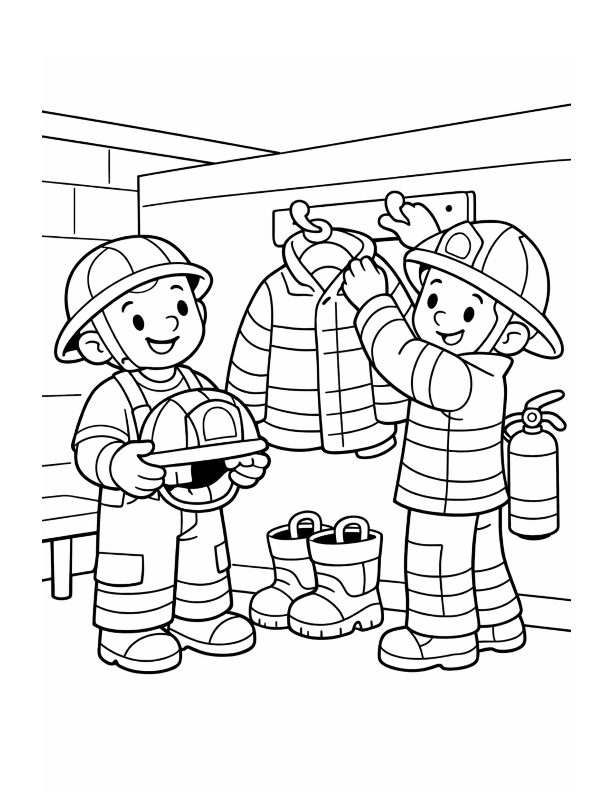 For this page, we entered the concept: “two firefighters hanging gear coloring page” on Colorin AI and generated a print ready coloring page in seconds.