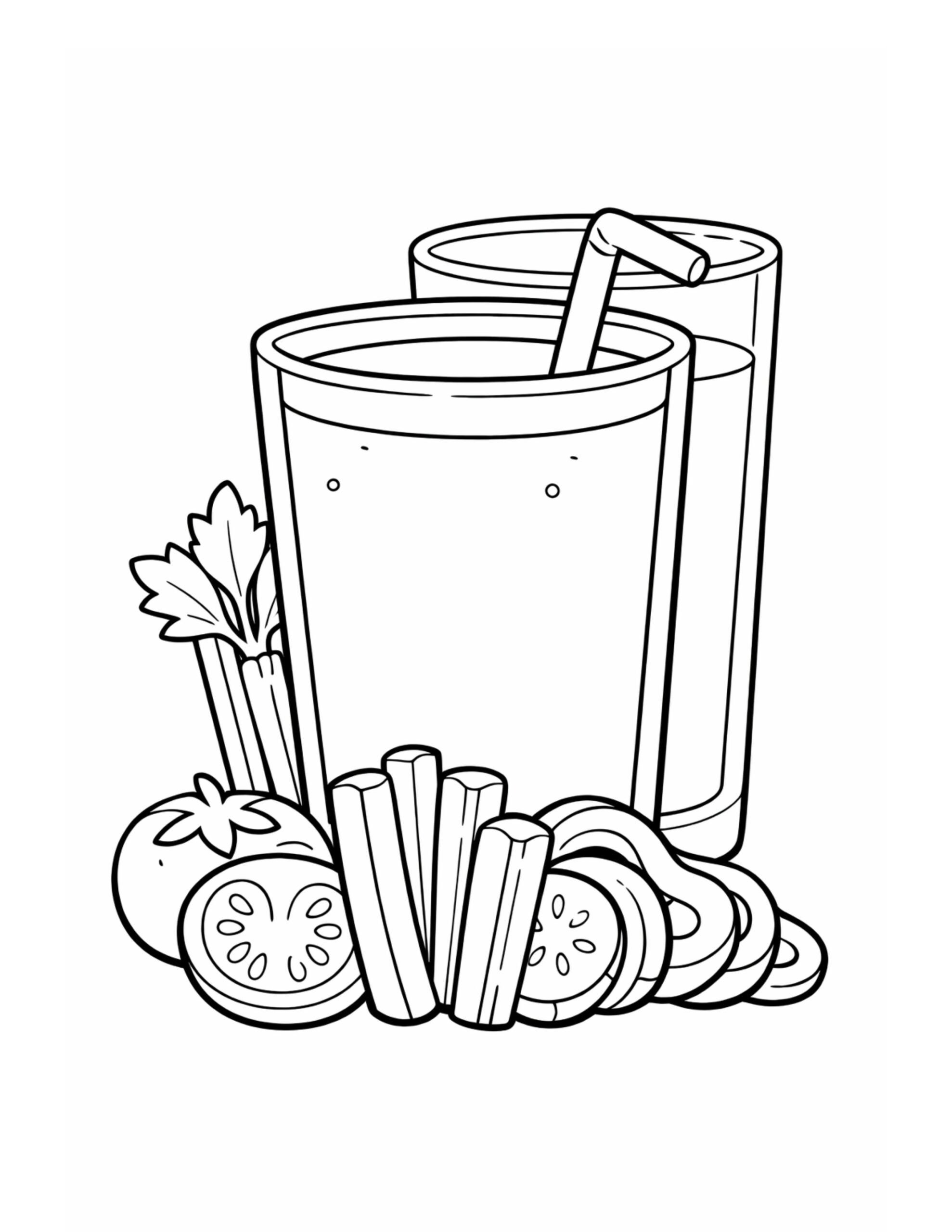 This two veggie juice glasses coloring page shows two tall drinks with straws, placed behind fresh ingredients like celery sticks, a tomato, and sliced cucumber. Right away, the clean outlines make the scene feel crisp and simple to color. Plus, the mix of smooth glass shapes and crunchy veggies keeps it fun from start to finish.