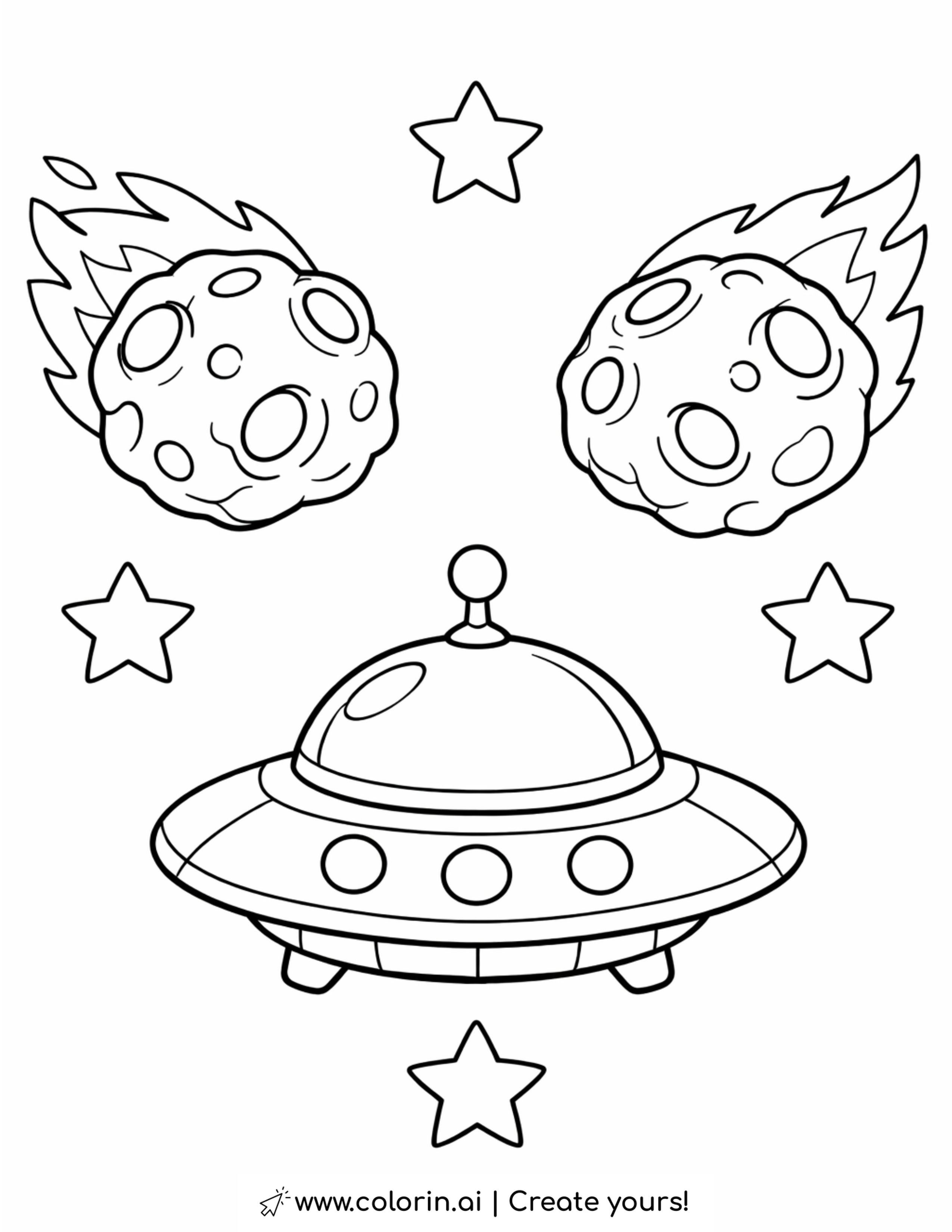 Coloring a playful space scene encourages creativity and curiosity about the universe. The flying saucer and meteors invite children to imagine exciting stories about mysterious journeys through space.