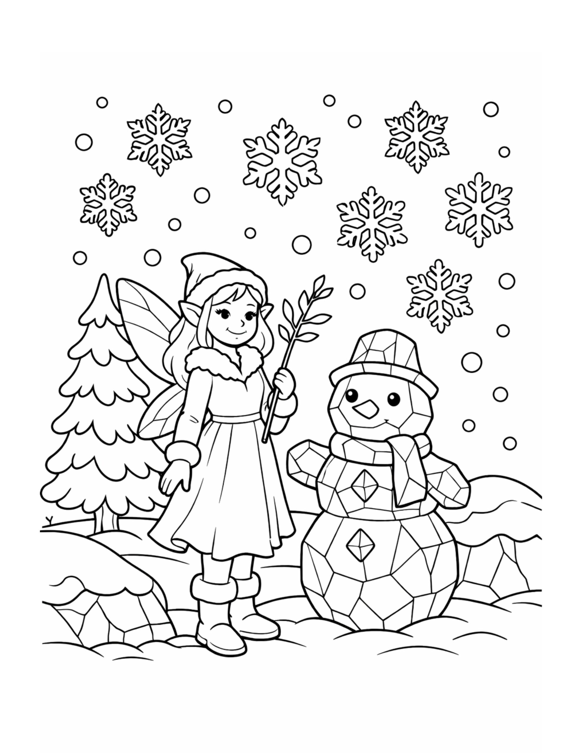 Winter Fairy and Snowman Winter Scene Coloring Page