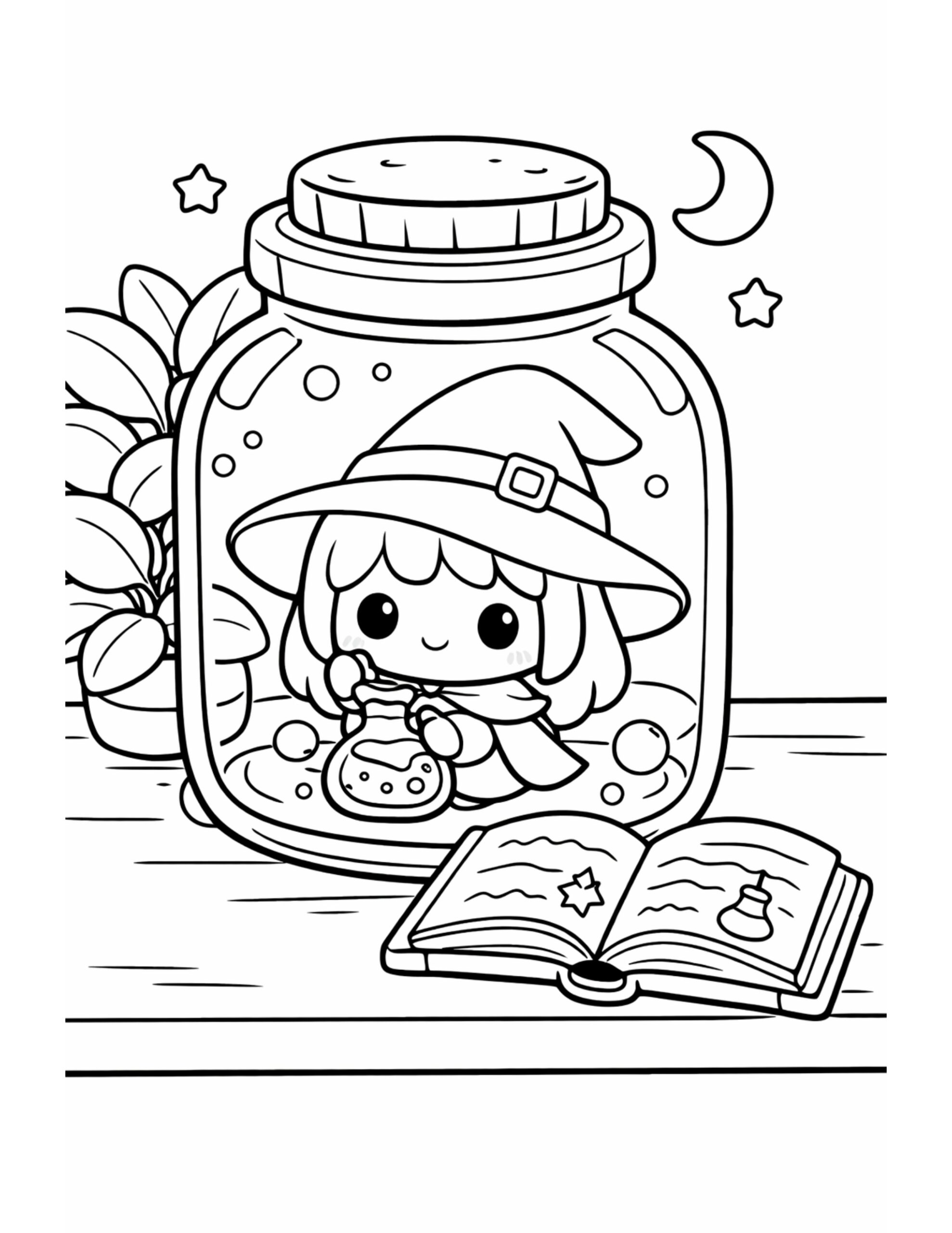 For this page, we entered the concept: “witch in a cozy jar coloring page” on Colorin AI and generated a print ready coloring page in seconds.