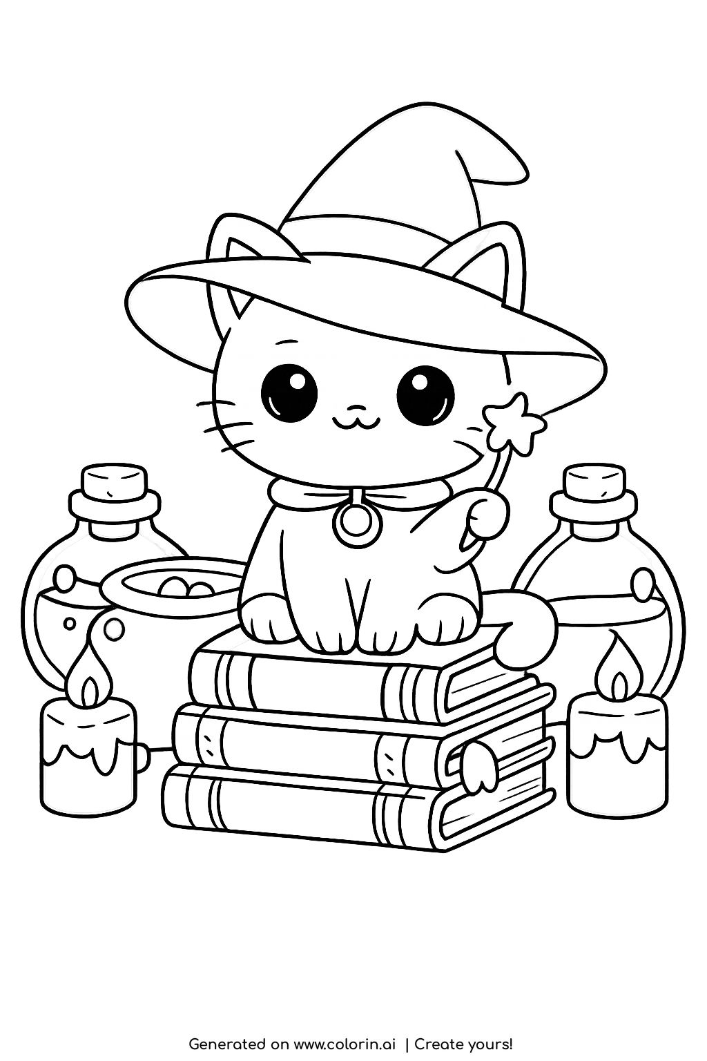 For this page, we entered the concept: wizard cat sitting on books coloring page on Colorin AI and generated a print ready coloring page in seconds.