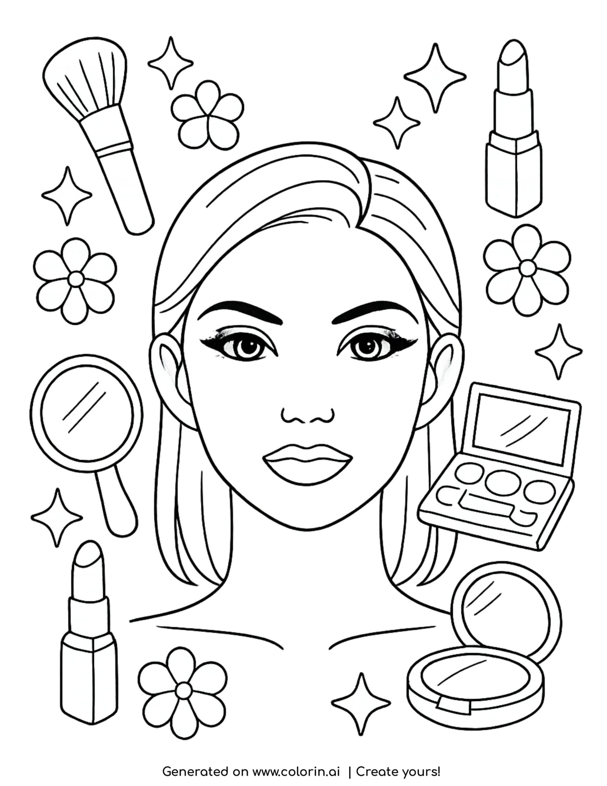 For this page, we entered the concept: woman face with makeup items coloring page on Colorin AI and generated a print ready coloring page in seconds.