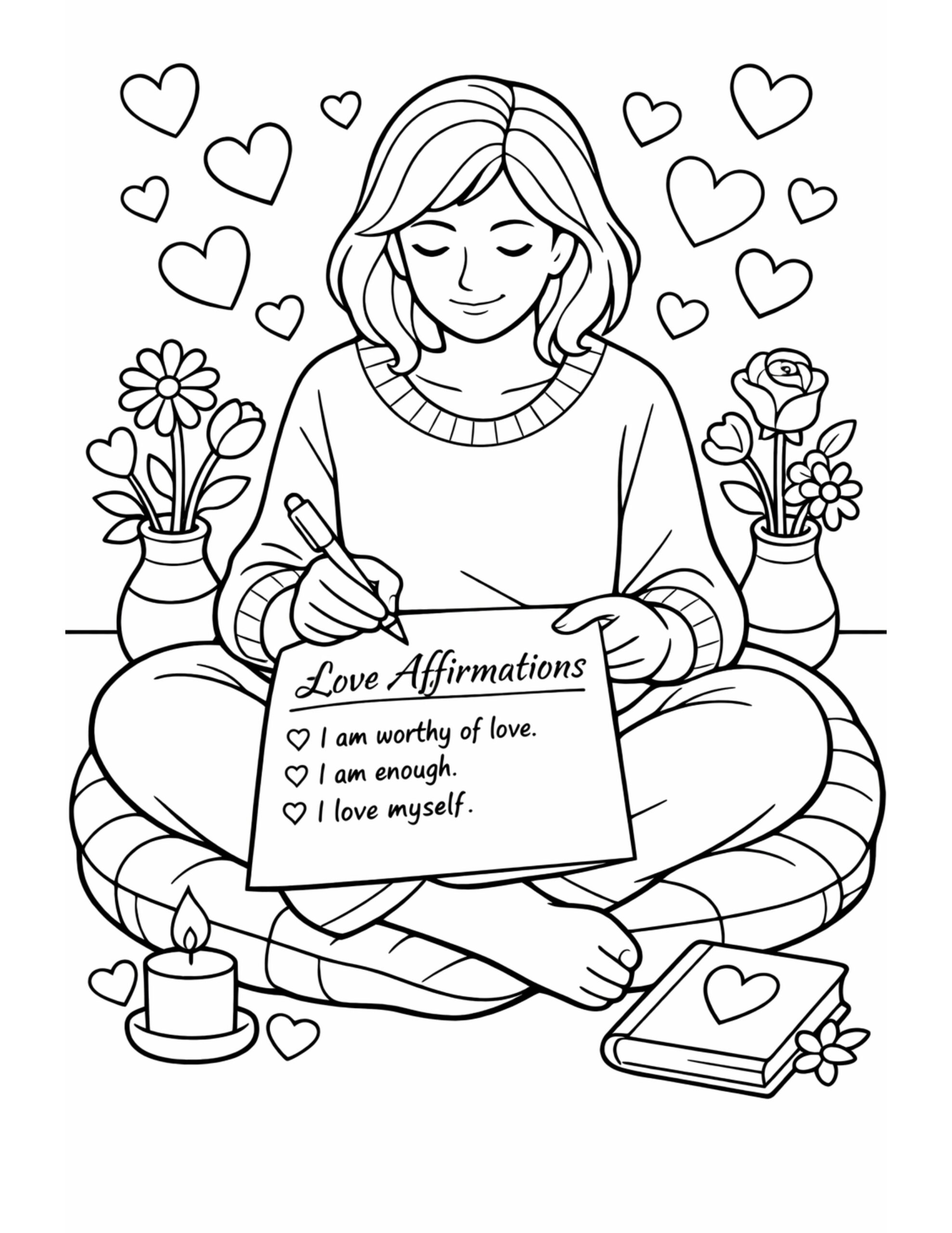For this page, we entered the concept: “woman writing love affirmations coloring page, a peaceful woman writing on an affirmations sheet while hearts float around her with flowers, a candle, and a small book nearby” on Colorin AI and generated a print ready coloring page in seconds.